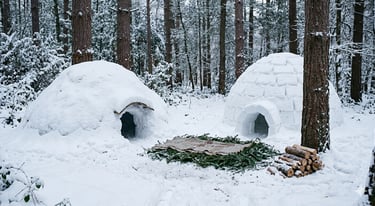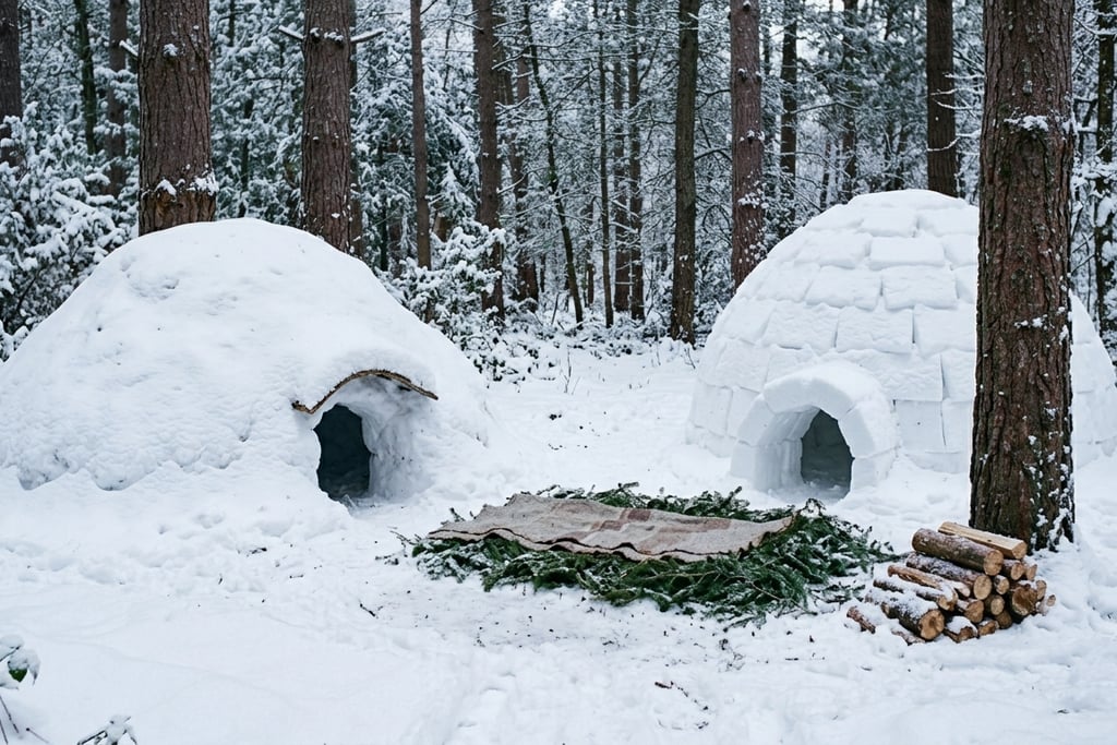 Quando a neve é abundante, ela deixa de ser inimiga e vira aliada. A neve é um excelente isolante térmico — o interior de um abrigo de neve pode ser 20 a 30°C mais quente que o exterior.