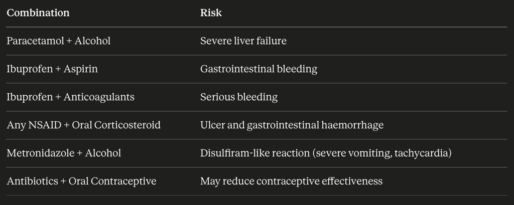 ❌ NEVER combine with alcohol — risk of severe liver failure. Overdose is silent and irreversible — symptoms appear too late. Most combined cold and flu medications already contain paracetamol — taking them alongside plain paracetamol is a common accidental overdose.