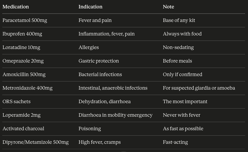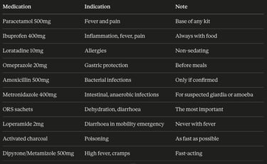 Loperamide (4 mg initial + 2 mg after each liquid bowel movement — max 16 mg/day): diarrhoea — controls symptoms when hydration is ensured and mobility is required. Never use with high fever or bloody diarrhoea.
