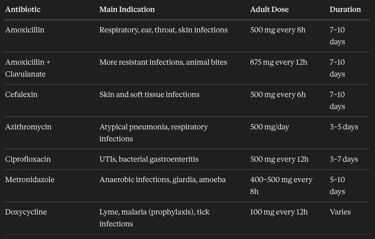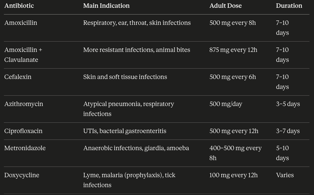 ✅ Bacterial tonsillitis (white patches on throat with no runny nose), urinary tract infections, bacterial pneumonia, spreading skin infections (cellulitis, erysipelas), infected wounds with systemic signs, bacterial sinusitis (facial pain + purulent discharge for over 10 days).