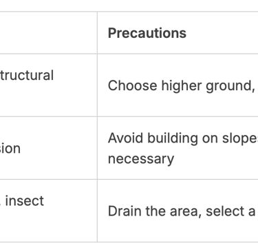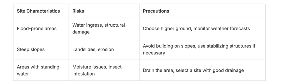 Selecting a building site that is prone to natural hazards or is otherwise unstable can have disastrous consequences. Factors such as flood zones, landslide areas, and proximity to standing water should be carefully evaluated.