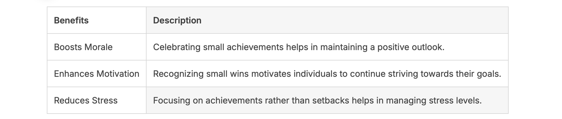 A table summarizing the benefits of celebrating small wins is provided below: