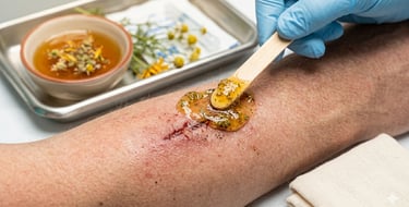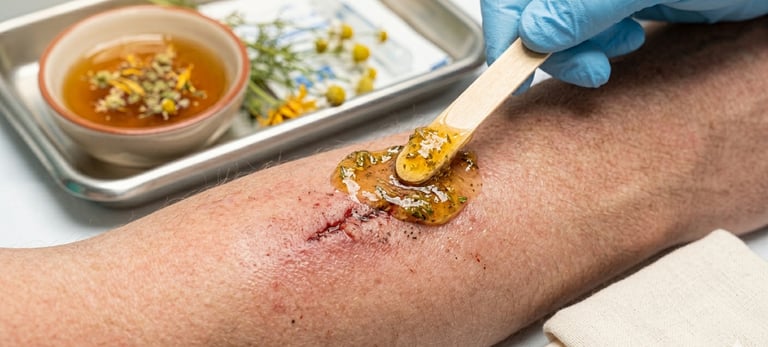 Multiple mechanisms: acid pH (3.2–4.5) inhibits bacterial growth; osmotic activity dehydrates bacteria; slow-release hydrogen peroxide has antibacterial effect; anti-inflammatory properties reduce swelling. Apply a generous layer of raw, pure honey directly to a clean wound. Cover with dressing. Change every 12–24h. Never use industrially processed honey.