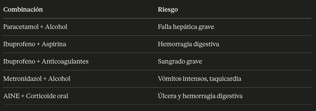 ❌ NUNCA combines con alcohol — riesgo de falla hepática grave. La sobredosis es silenciosa e irreversible.