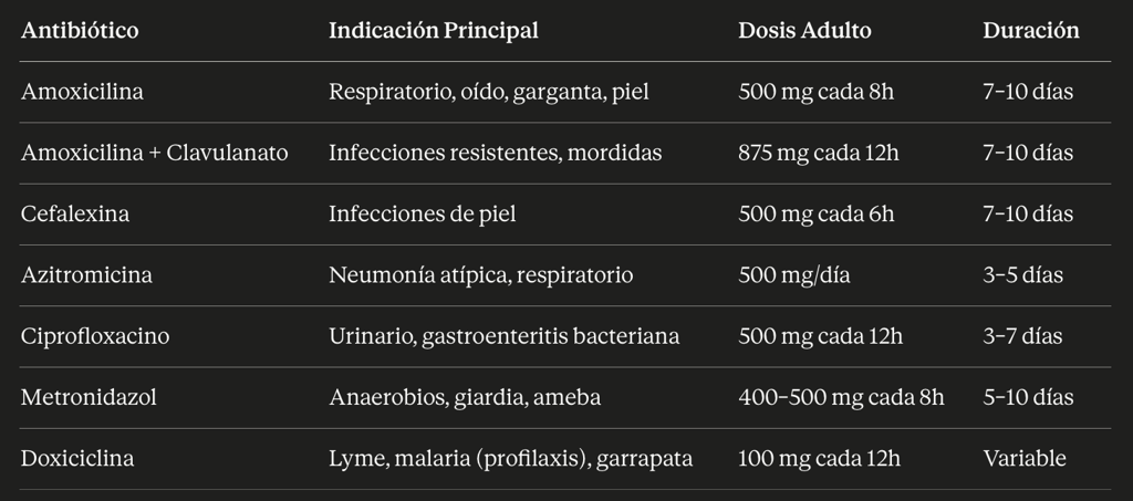 ✅ Faringitis bacteriana (garganta con pus y sin mucosidad nasal), infección urinaria, neumonía bacteriana, infecciones de piel con propagación, heridas infectadas con signos sistémicos.