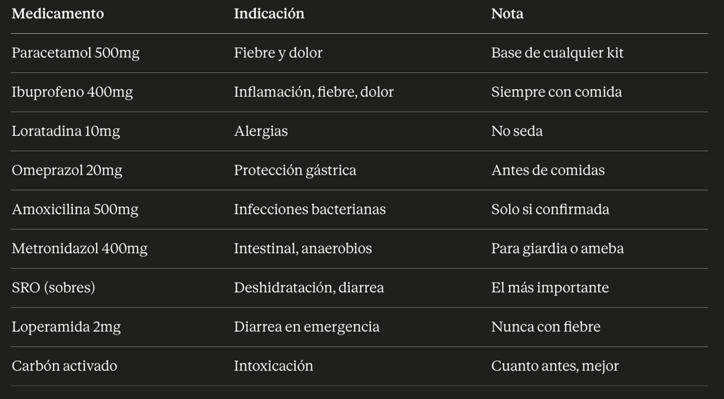 Loperamida (4 mg inicial + 2 mg tras cada deposición líquida): diarrea — solo para controlar síntoma cuando la hidratación está garantizada. Nunca con fiebre alta o sangre.